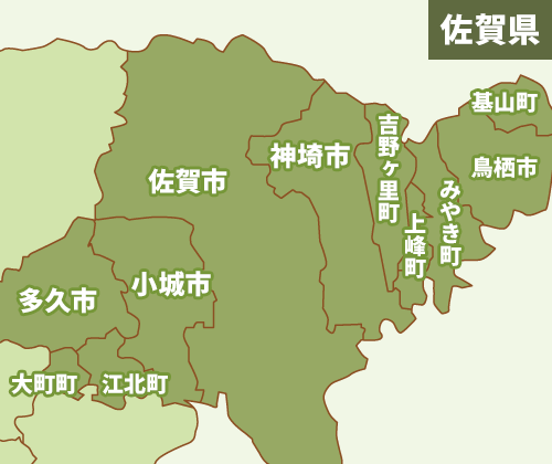 佐賀市・小城市・多久市・神崎市・吉野ヶ里町・江北町・大町町・鳥栖市・三養基郡